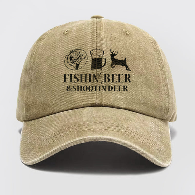 Fishin', Beer & Shootin' Deer Washed Baseball Cap
